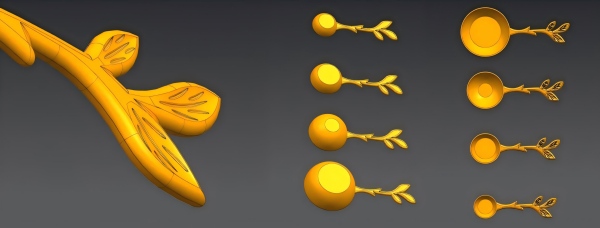 Prvič, vključevalo je oceno oblike izdelka in možne uporabe na podlagi predhodnih izkušenj. Z uporabo cinkove zlitine kot primarnega materiala smo izračunali gostoto materiala in značilnosti površine, vključili ergonomijo in oblikovali splošne dimenzije za štiri merilne žličke ali žličke za led. Nato smo na podlagi teh dimenzij izboljšali vsako krivuljo, kote R-radija in druge manjše podrobnosti.