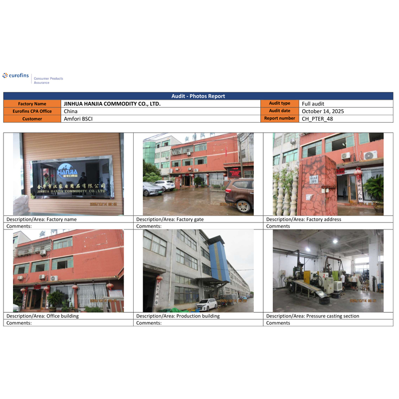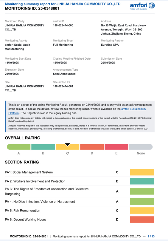 Jinhua Hanjia commodity Co., Ltd. je objavila rezultate revizije BSCI. Podjetje je 14. oktobra uspešno prestalo strokovno oceno in pridobilo certifikat razreda C, ki izpolnjuje minimalne zahteve, ki jih določi stranka. Obdobje veljavnosti tega certifikata je eno leto. Revizijo BSCI je izvedla agencija EUROFINS, ki jo je izbrala stranka. Ta stranka je kupovala odpirače za vino, dodatke za vino in izdelki iz nerjavečega jekla, kot je shaker za koktajle, iz našega podjetja že dolgo časa. Država stranke zahteva, da imajo dobavitelji ta certifikat.