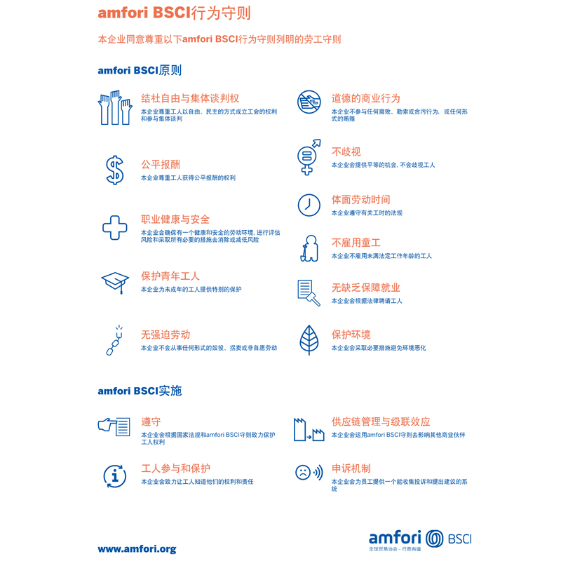 V skladu z zahtevami predpisov BSCI se bo naše podjetje dosledno držalo delovnih smernic, opisanih v Kodeksu ravnanja Amfori BSCI, da bi zagotovilo učinkovito izvajanje načel BSCI. Med proizvodnim procesom spoštujemo pravice delavcev do ustanavljanja sindikatov na svoboden in demokratičen način ter do sodelovanja v kolektivnih pogajanjih. Prav tako se zavezujemo k nediskriminaciji, izogibamo zaposlovanju otroškega dela in zagotavljamo, da delavci prejemajo poštene delovne prakse in nadomestila. Poleg tega zagotavljamo, da imajo delavci dostojen delovni čas in druge temeljne pravice.