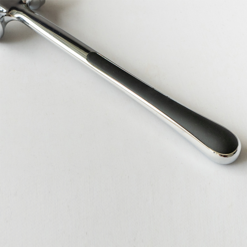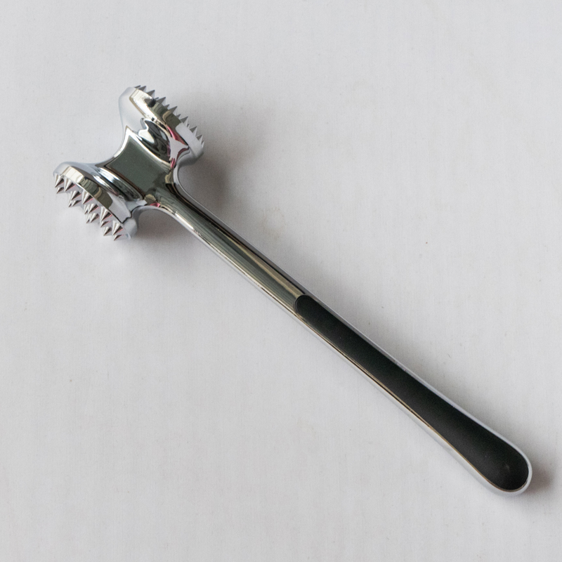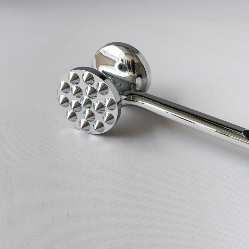 To je naprava za mehčanje mesa iz cinkove zlitine, ki jo proizvaja Jinhua Hanjia Commodity Co., Ltd., proizvedena z integriranim postopkom tlačnega litja. Kovinska površina je skrbno polirana ročno, celoten izdelek pa je podvržen okolju prijaznemu varnemu postopku galvanizacije. Premaz se nato pasivizira, da postane trd kot jeklo. Z dolžino 22 cm je popolne velikosti za udoben oprijem pri odraslih. roko. Porazdelitev teže med sprednjim in zadnjim delom mehčalca mesa je zasnovana v skladu z zlatim rezom, kar uporabnikom omogoča udarjanje po mesu z minimalnim naporom, pri čemer se zanaša izključno na gravitacijo glave kladiva. Glava mehčalca mesa ima dve različni površini za različne vrste mesa. Plastični blažilniki na obeh straneh ročaja zagotavljajo udobje pri dolgotrajni uporabi. Skupna teža mehčalca je 275 gramov, njegova oblika pa zagotavlja odlično funkcionalnost, hkrati pa zniža stroške v primerjavi s tradicionalnimi modeli za več kot 13%. Prav tako je zelo enostaven za čiščenje, preprosto ga lahko sperete z vodo ali uporabite pomivalni stroj.
